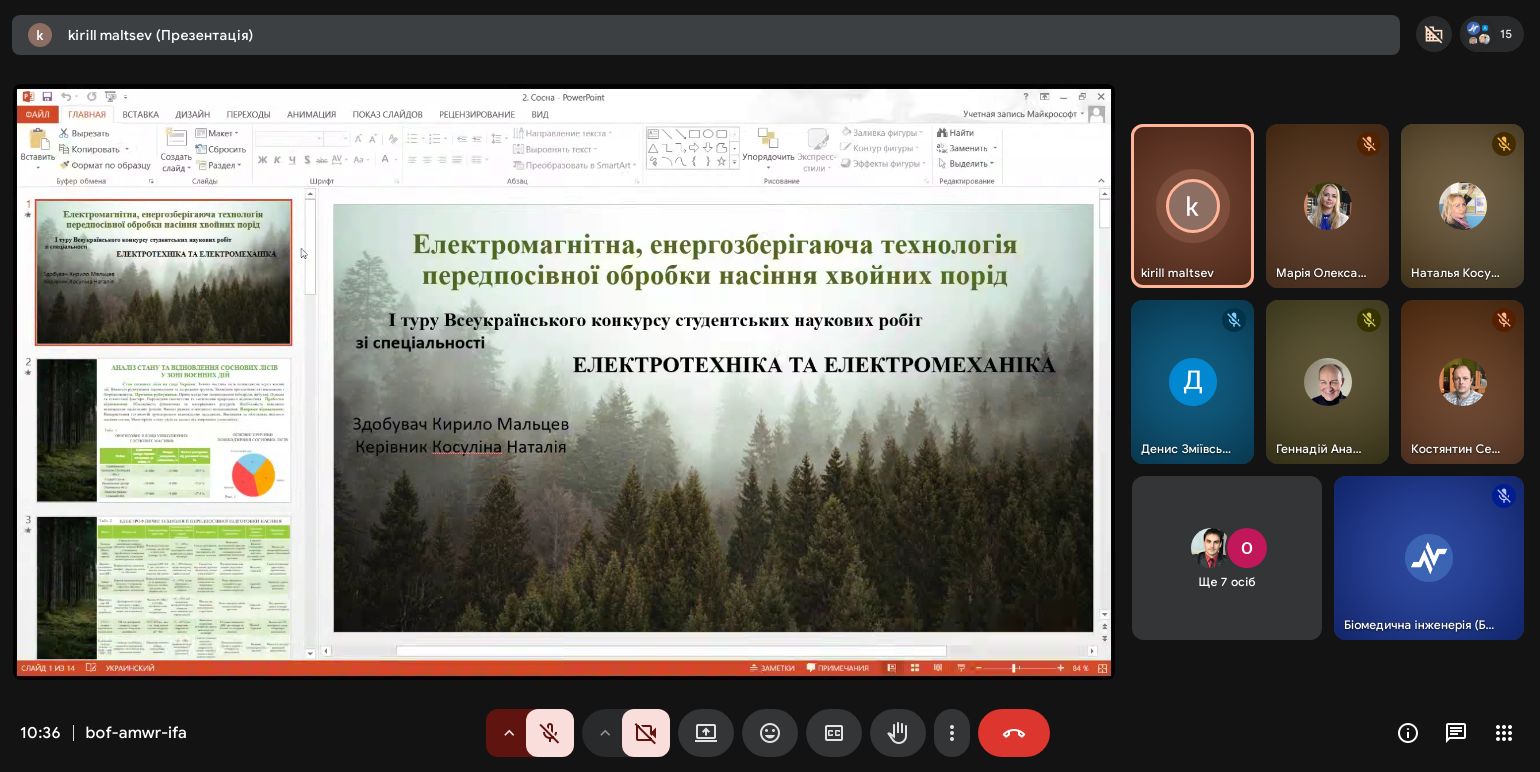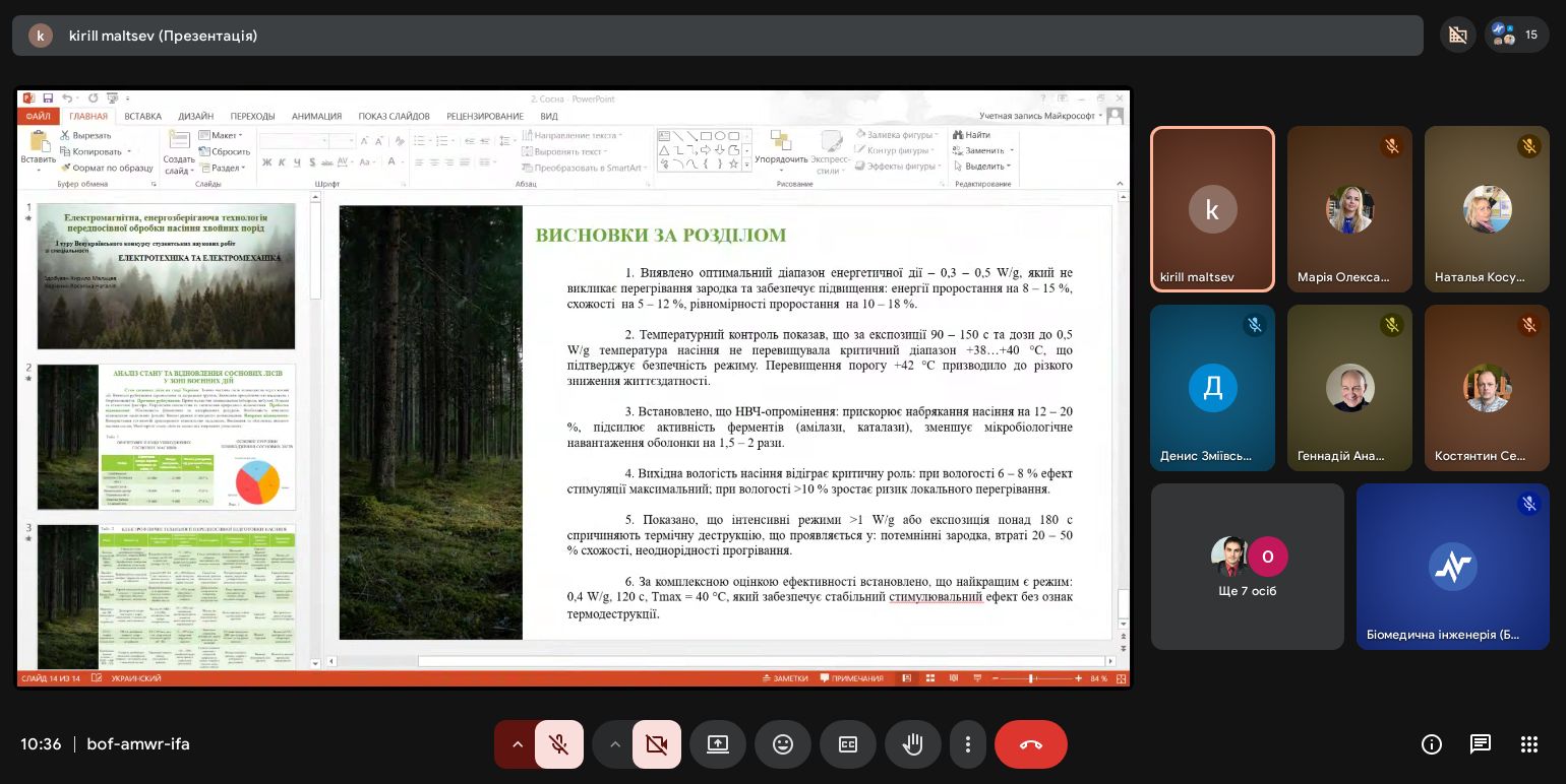 | Диплом І ступеня Електромагнітна, енергозберігаюча технологія передпосівної обробки насіння хвойних порід | Кирило Мальцев G3-25м-01 | Наталія Косуліна д.т.н., проф. |
