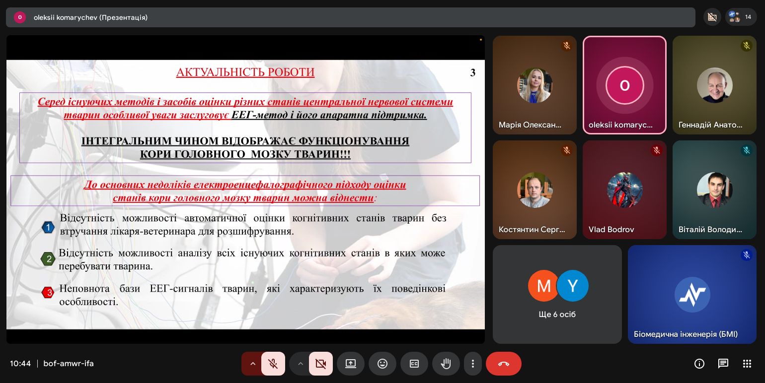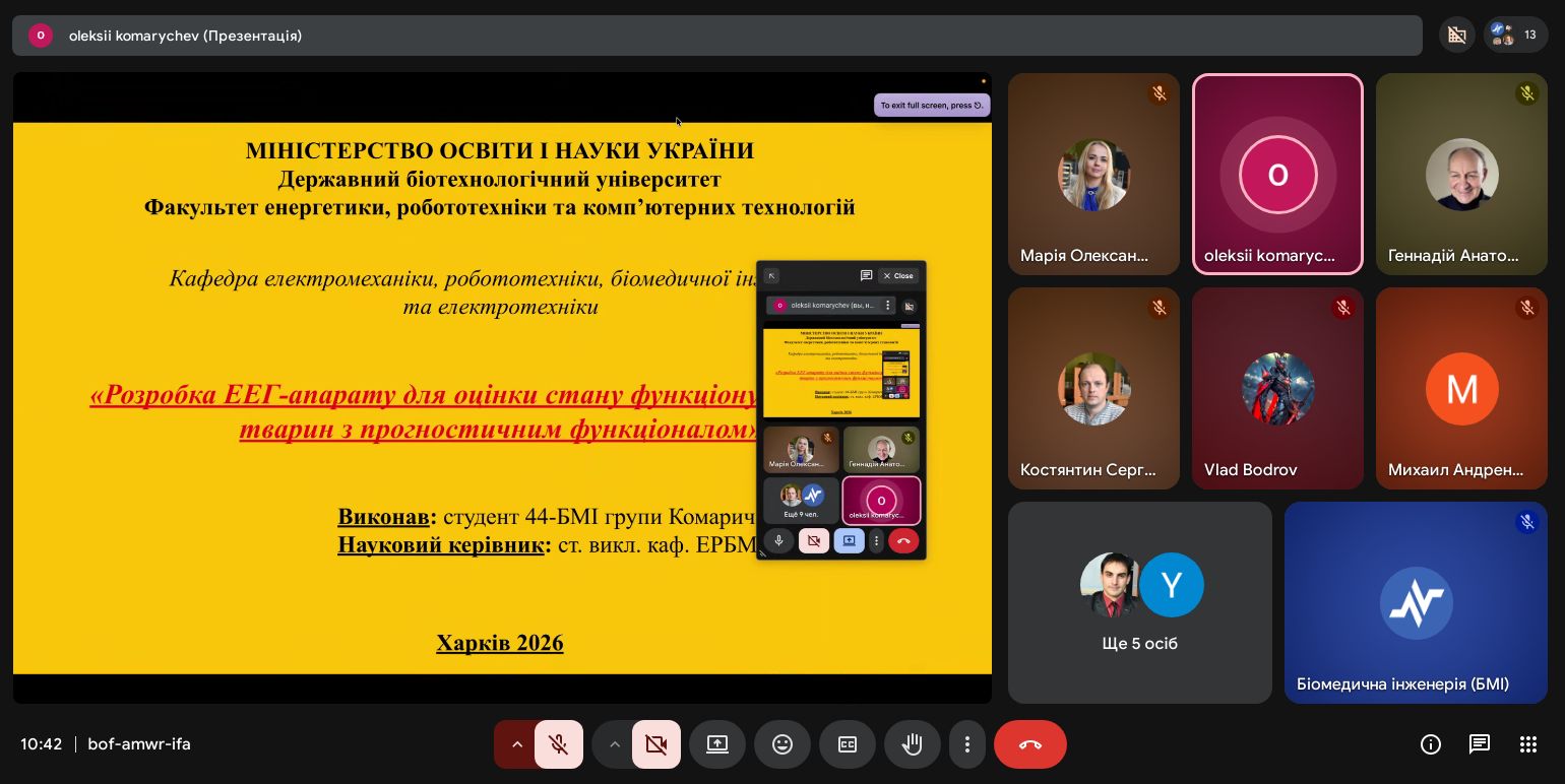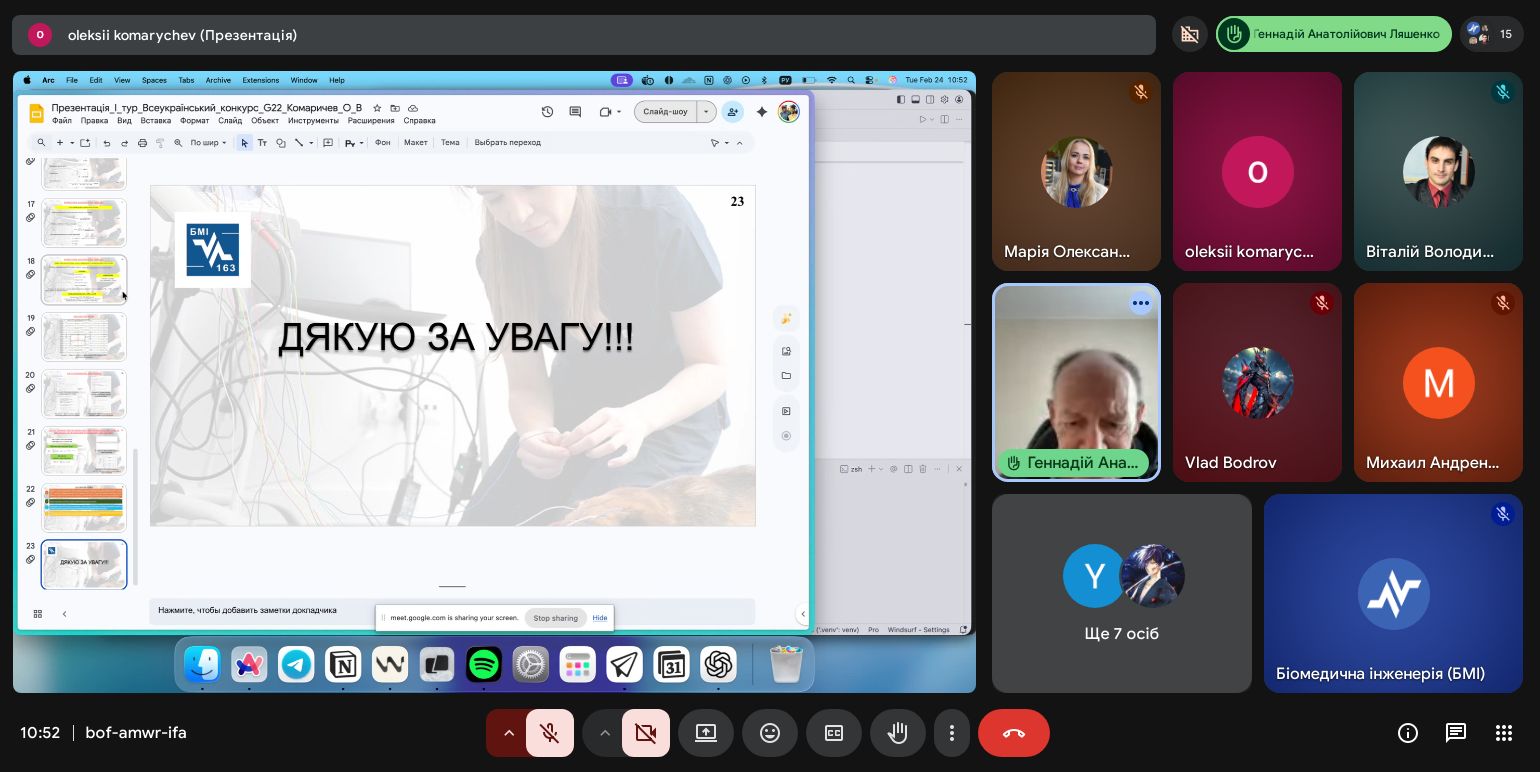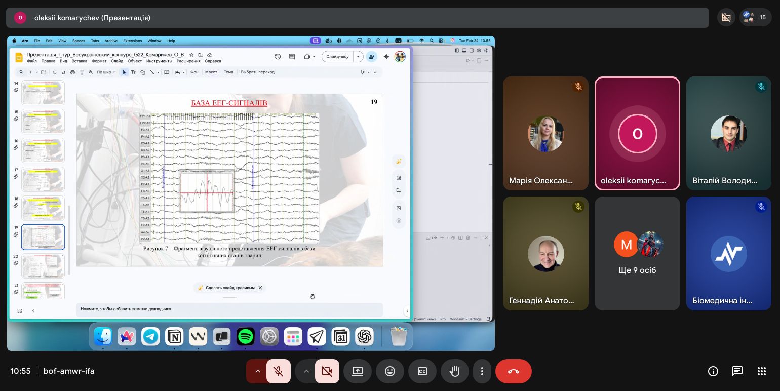 | Диплом І ступеня Розробка ЕЕГ-апарату для оцінки стану функціонування мозку тварин з прогностичним функціоналом | Олексій Комаричев 163-22б-04 | Віталій Сухін старший викладач |