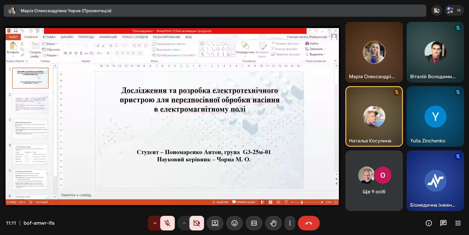 | Диплом ІІ ступеня Дослідження та розробка електротехнічного пристрою для передпосівної обробки насіння в електромагнітному полі | Антон Пономаренко G3-25м-01 | Марія Чорна к.т.н., доц. |