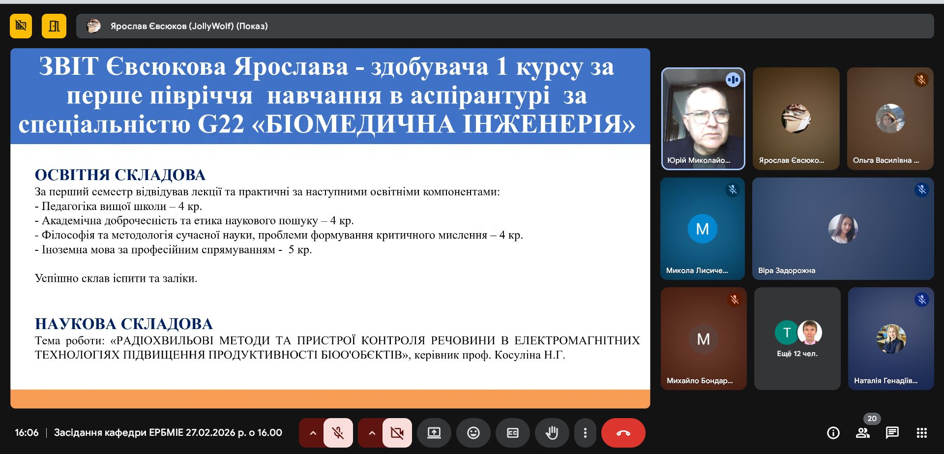 Здобувачі освітньо-наукової програми “Біомедична інженерія” третього освітнього рівня (доктор філософії) на засіданні кафедри ЕРБМІЕ представили проміжні звіти з виконання індивідуального плану роботи за 2025-2026 навчальний рік.